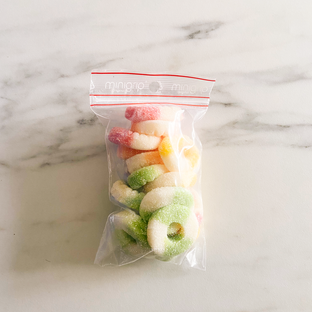 Ingrédients : Sirop de glucose-fructose - Sucre - Gélatine - Acidifiants (Acide citrique, Acide malique) - Correcteur d'acidité (Malate de sodium) - Arôme - Colorants (E161b, E120, E133) .