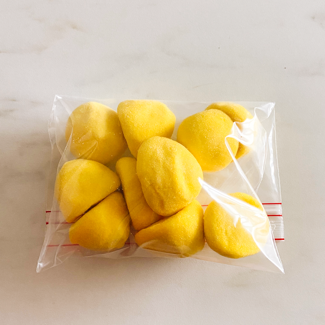Une délicieuse guimauve entourée d'une légère couche de sucre au goût Banane. Vendu par 50g ou par 100g.