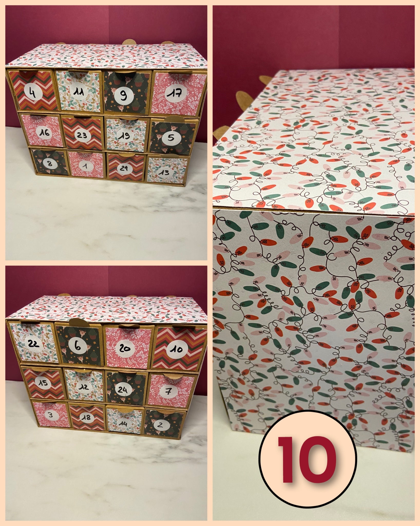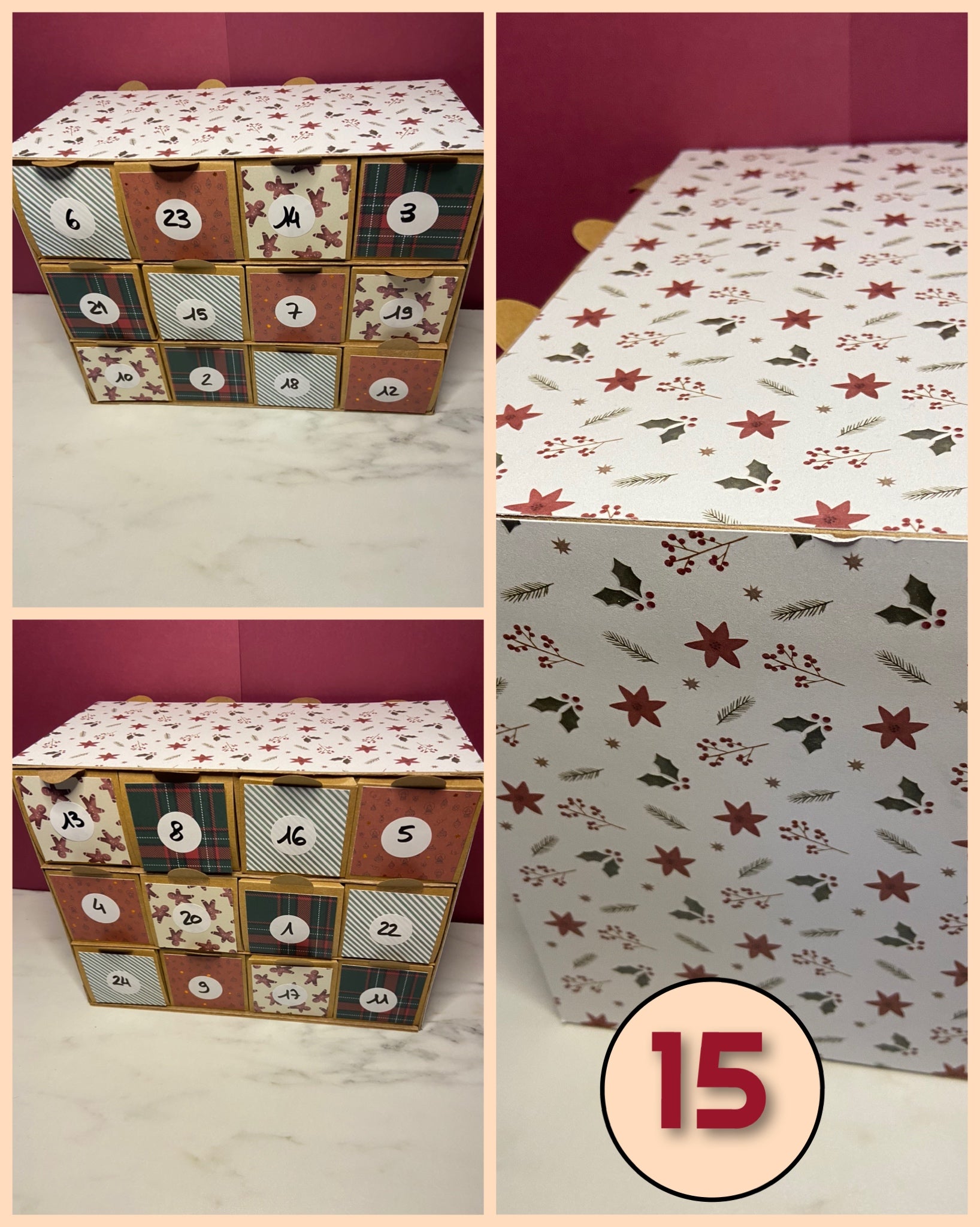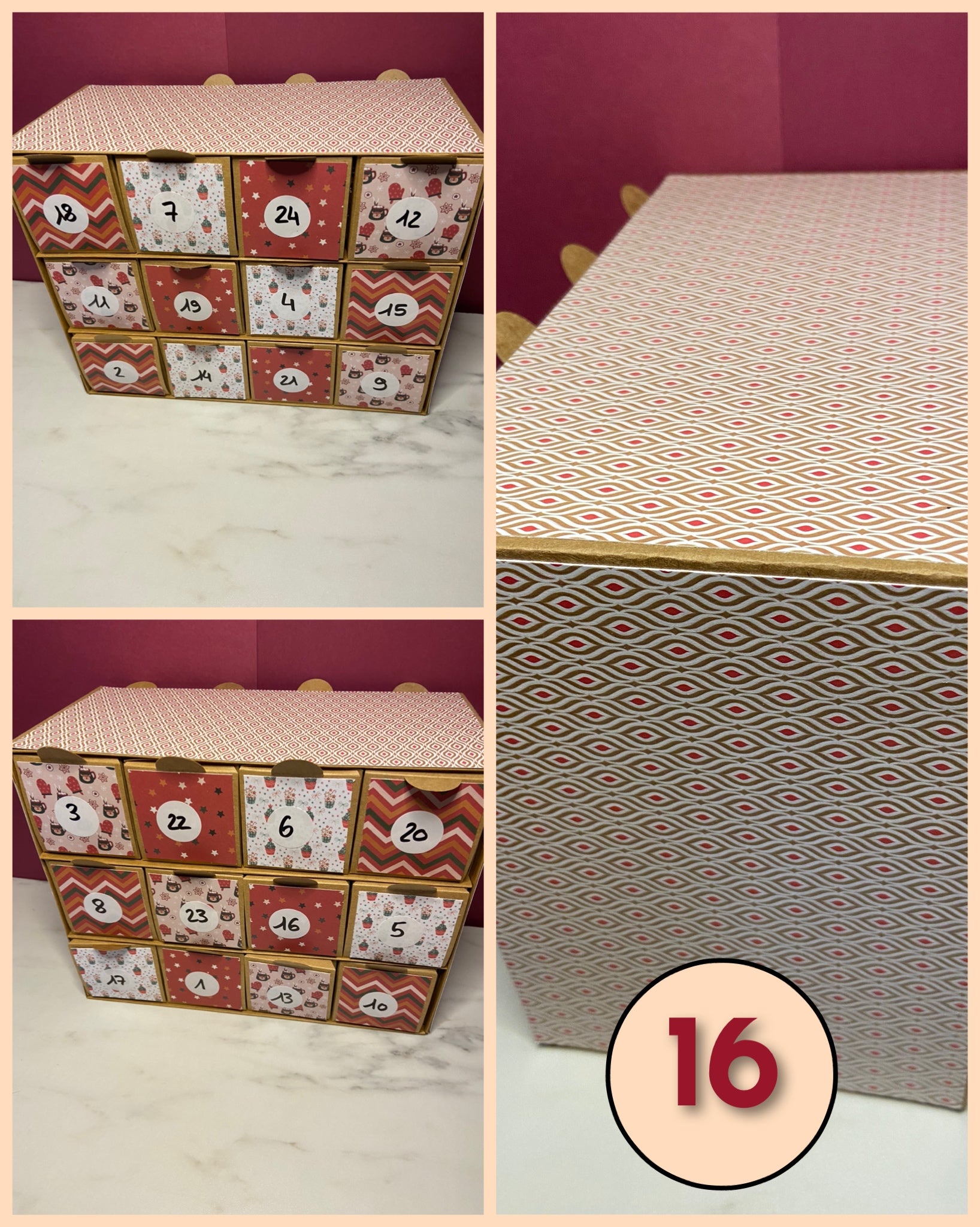 Calendrier de l'avent fait mains, réutilisables si vous en prenez soin. Ils peuvent ne pas être parfait puisqu'ils n'ont pas été faits de manière industrielle. Ils sont en nombre limités et en modèle unique, d'où le choix du modèle.