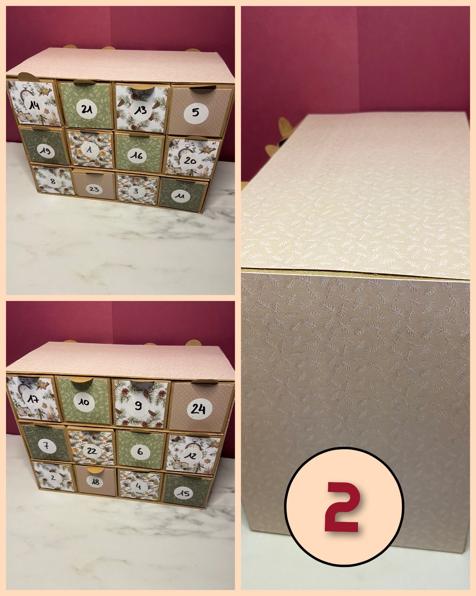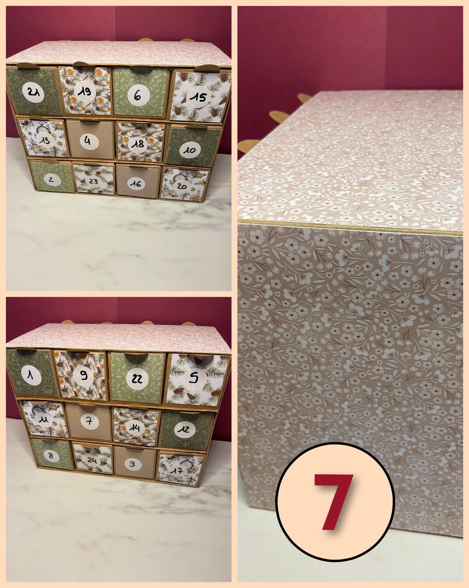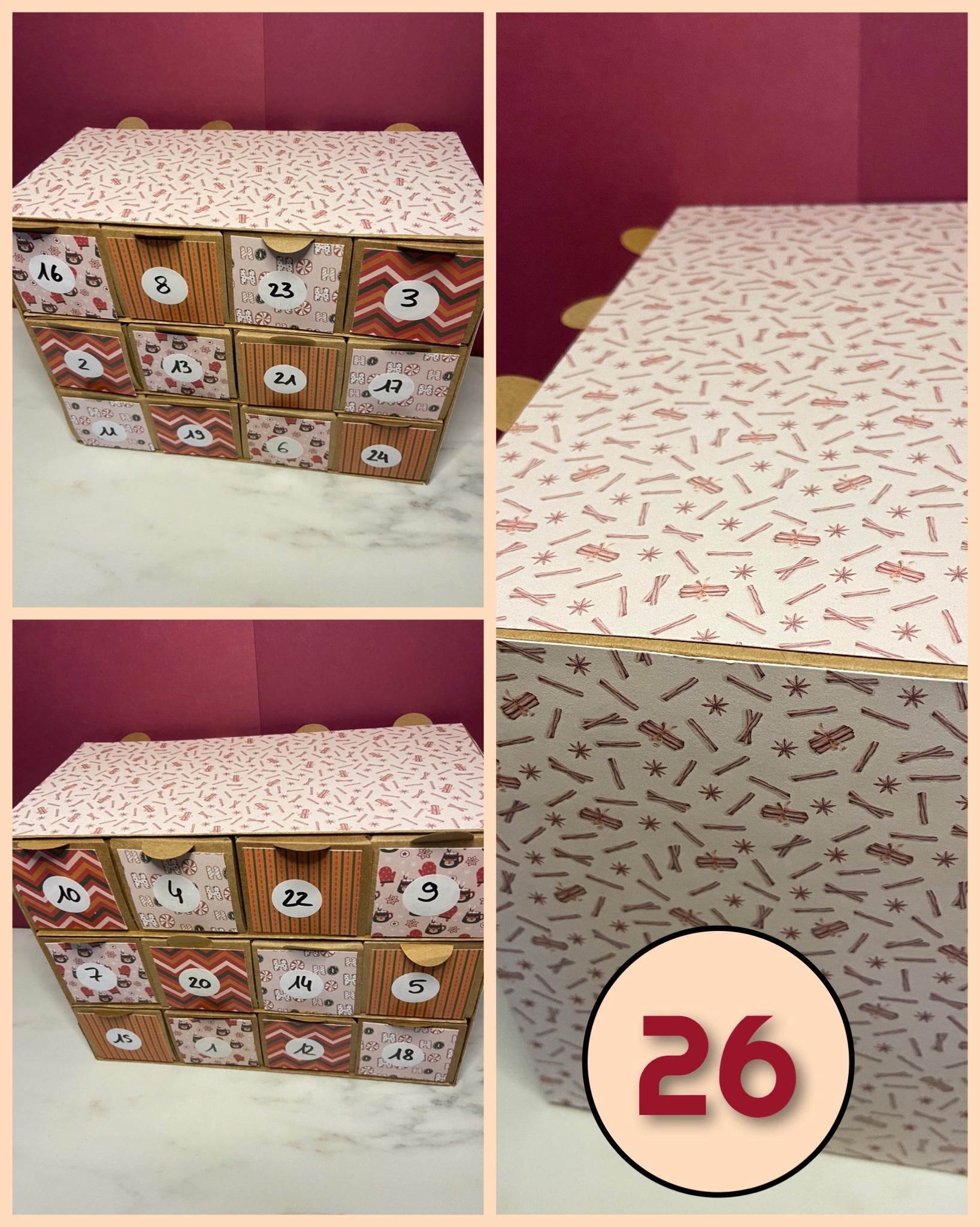 Calendrier de l'avent fait mains, réutilisables si vous en prenez soin. Ils peuvent ne pas être parfait puisqu'ils n'ont pas été faits de manière industrielle. Ils sont en nombre limités et en modèle unique, d'où le choix du modèle.