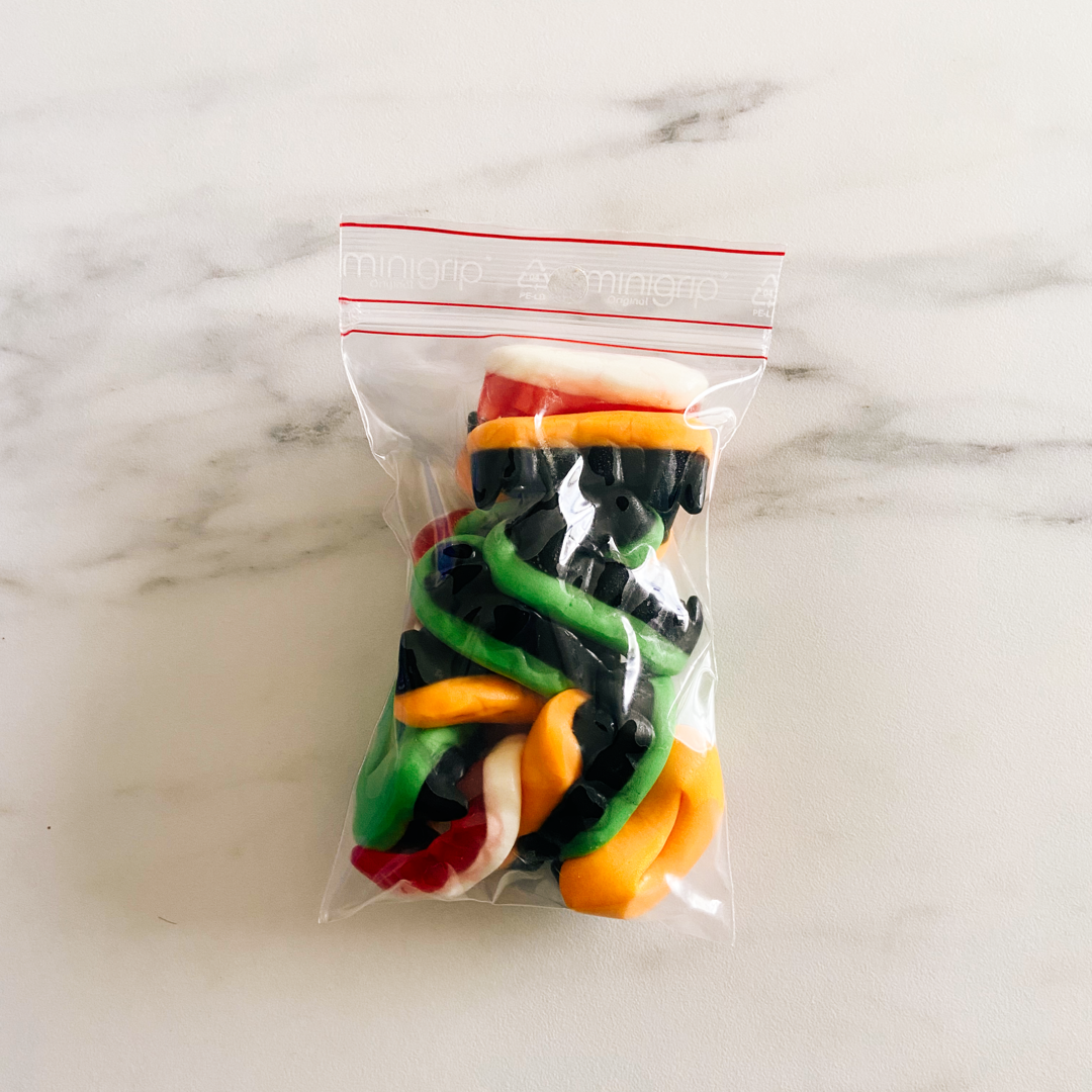Ingrédients : Sirop de glucose , gélatine , sucre , Acidifiants : acide citrique et acide lactique, aromes colorants: carmins, charbon végétal médicinal, curcumine, bleu brillant FCF(E133), agents d'enrobage: cire d'abeille, blanche et jaune, cire de carnauba.