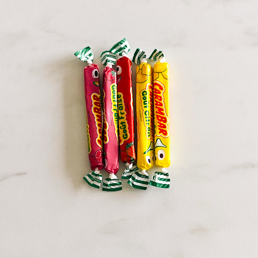 Pâte à mâcher 3 fruits possibles framboise, citron, fraise. Les lots sont composés des trois parfums + 2 au hasard.