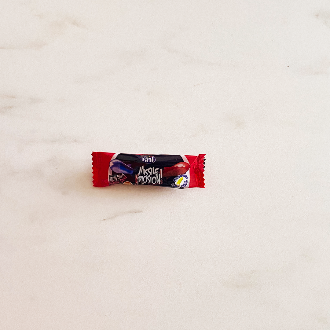 Chewing-Gum en forme de missile, au couleur rouge ou bleu, rempli d'un liquide acidulé.
