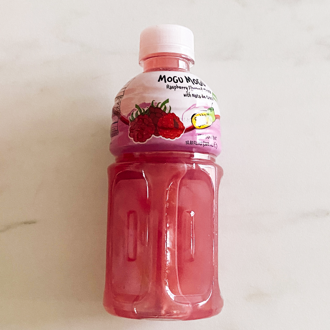 Boisson au goût de Framboise avec des bouts de noix de coco plongés dedans. Boire et manger en même temps, c'est possible grâce aux Mogu Mogu. Nous vous conseillons de le boire frais.