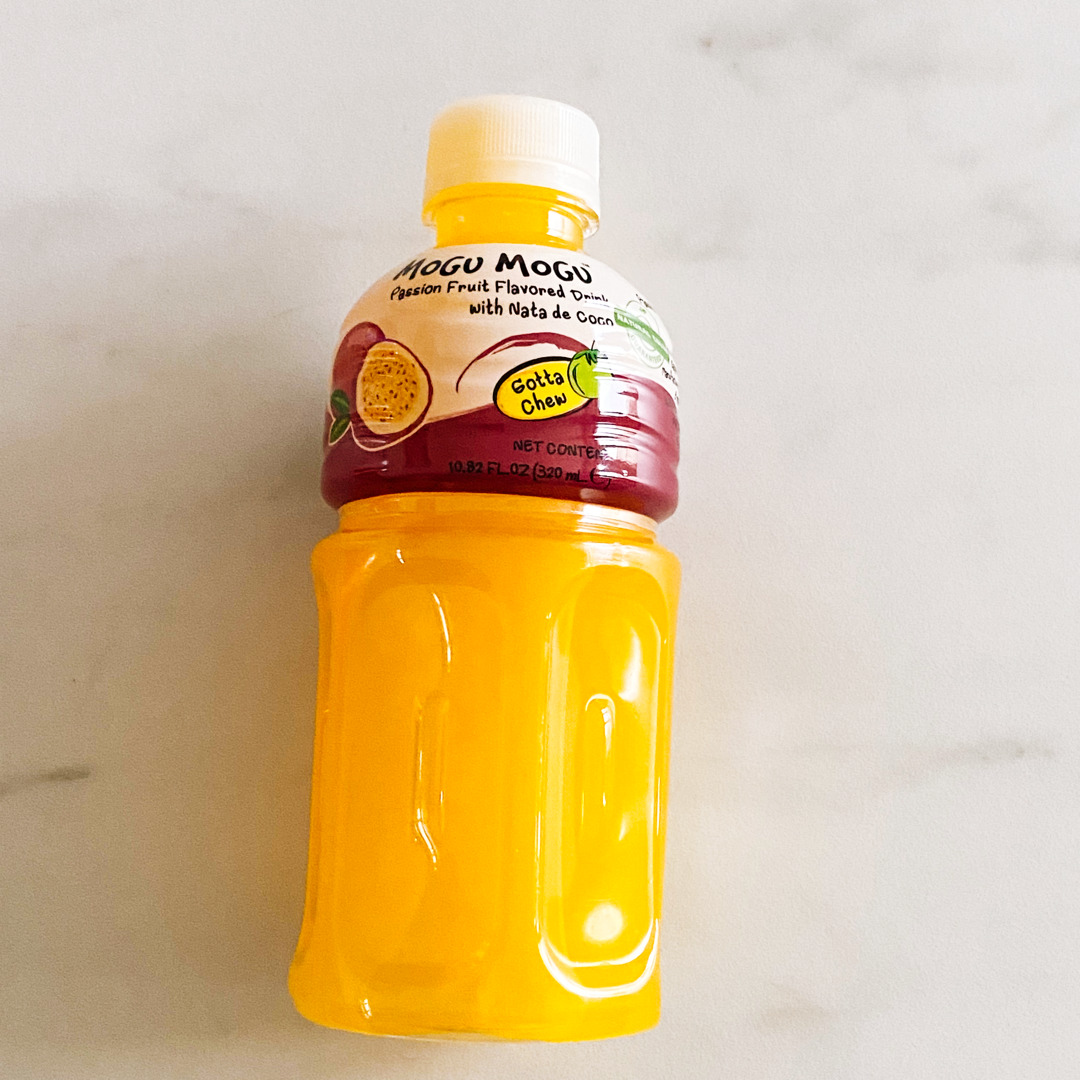 Boisson au goût de Passion avec des bouts de noix de coco plongés dedans. Boire et manger en même temps, c'est possible grâce aux Mogu Mogu. Nous vous conseillons de le boire frais.