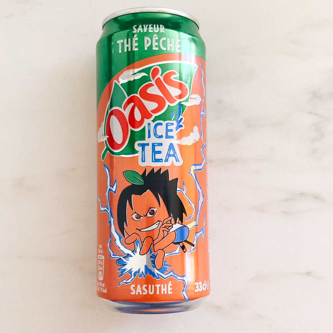 Oasis Ice Tea à la pêche dans sa version collector "Sasuthé" suite à la collaboration de Oasis et Naruto Shippuden.