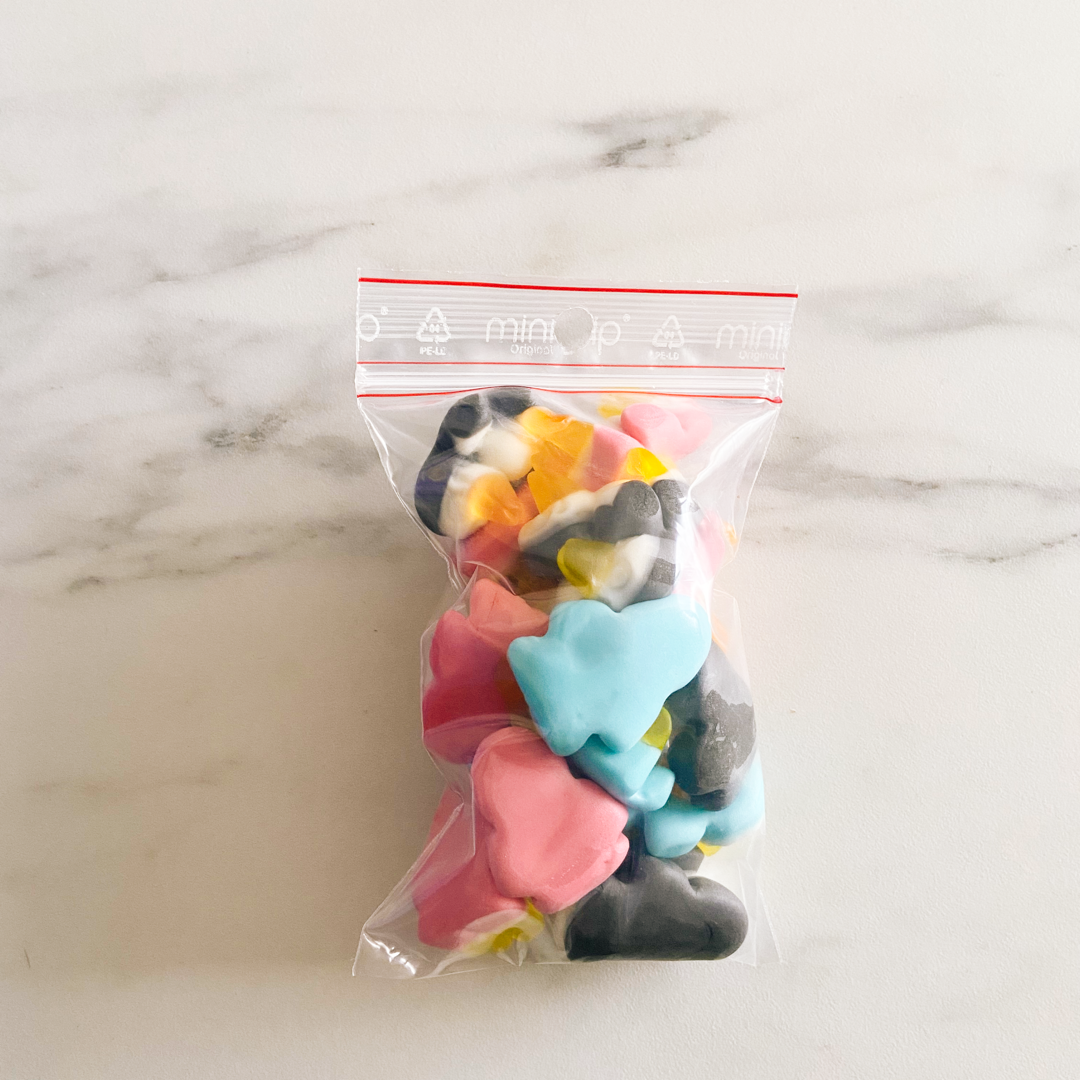 Ingrédients : Sirop de glucose, sucre, gélatine, acidifiants : acide citrique - acide lactique, gélifiant : pectine, aliments colorants : curcuma - radis - raisin - cerise - carthame, colorant : charbon végétal, carmins, bleu brillant FCF, agent d'enrobage : cire d'abeille blanche et jaune - cire de carnauba.