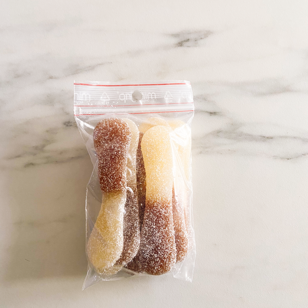 Ingrédients : Sucre, sirop de glucose, amidon modifié, acidifiants (acide lactique, acide malique), gélatine, sucre caramélisé, graisse végétale hydrogénée, arôme.