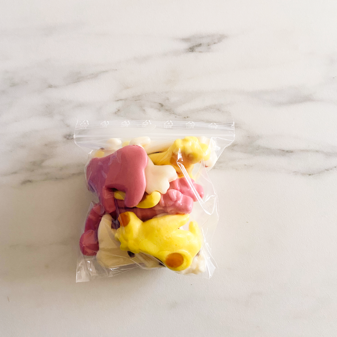 Ingrédients : Sirop de glucose, sucre, lait écrémé en poudre (6%), gélatine, acidifiant : acide citrique et acide lactique, gélifiant, pectine, arôme, aliments colorants (sureau, cassis, carottes, curcuma, citron, carthame, sirop de sucre caramélisé), agent d'enrobage : cire d'abeille (blanc et jaune), cire de carnauba.